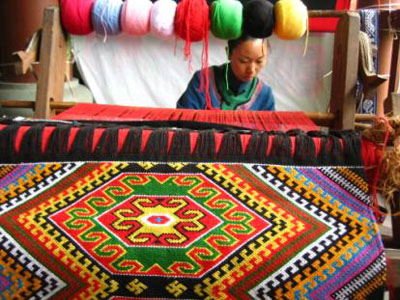 土家語(yǔ)中的“西蘭卡普”是一種土家織錦。“西蘭”是“被面”,“卡普”即“花”,“西蘭卡普”就是土家族的花鋪蓋,是土家姑娘的珍貴嫁妝。西蘭卡普多以絲、棉、麻為原料,一般以紅、藍(lán)、青三種顏色為經(jīng)線(xiàn),緯線(xiàn)可以自由選擇顏色。用古式織機(jī)、挑花刀采取通經(jīng)斷緯、反面挑織的方法手工挑織而成。西蘭卡普構(gòu)圖大方,織工精巧,花樣豐富,色彩鮮明熱烈而古樸,被稱(chēng)為土家文化的活化石。