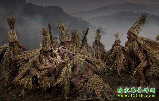 毛古斯,這是土家族最原始、最古老、最粗獷的一種歌舞。表演這種歌舞的人,全身上下裹稻草,腰纏稻草辮,前面還有一根用紅布包頭做的小圓棒。頭上也戴著由稻草扎成的草辮。領(lǐng)頭跳的叫“老毛古斯”,跟著跳的叫“小毛古斯”。其中一個(gè)扮演“古魯子”(類似騙子與歹徒),其余形象一般相同。演員們邊跳舞并發(fā)出“嗨嗨”之聲。舞蹈內(nèi)容主要反映土家人古代原始生產(chǎn)斗爭(zhēng),如打獵、捕魚等等。