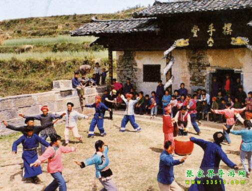 “仗鼓舞”,是白族一種古老、獨(dú)特、剛勁的民族舞蹈。它流傳于白族地區(qū)。武陵源一帶的白族同胞都非常喜歡這種舞蹈。